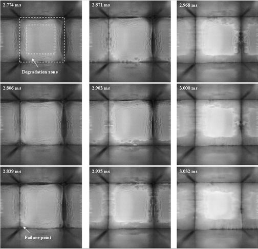 A dense particle flow is generated by the interaction of a shock wave with an initially stationary packed granular bed. High-speed particle dispersion research is motivated by the energy release enhancement of explosives containing solid particles. The initial packed granular bed is produced by compressing loose powder into a wafer with a particle volume fraction of Φ = 0.48. The wafer is positioned inside the shock tube, uniformly filling the entire cross-section. This results in a clean experiment where no flow obstructing support structures are present. Through high-speed shadowgraph imaging and pressure measurements along the length of the channel, detailed information about the particle shock interaction was obtained. Due to the limited strength of the incident shock wave, no transmitted shock wave is produced. The initial “solid-like” response of the particle wafer acceleration forms a series of compression waves that eventually coalesce to form a shock wave. Breakup is initiated along the periphery of the wafer as the result of shear that forms due to the fixed boundary condition. Particle break-up is initiated by local failure sites that result in the formation of particle jets that extend ahead of the accelerating, largely intact, wafer core. In a circular tube the failure sites are uniformly distributed along the wafer circumference. In a square channel, the failure sites, and the subsequent particle jets, initially form at the corners due to the enhanced shear. The wafer breakup subsequently spreads to the edges forming a highly non-uniform particle cloud.